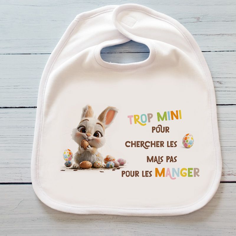 "Bavoir bébé original et pratique, pour votre tout-petit à Pâques, Conçu pour les enfants de 0 à 3 ans, il accompagne les premiers repas avec légèreté tout en protégeant efficacement les vêtements.Sa fermeture à scratch permet une mise en place rapide et un bon maintien autour du cou. Le verso en éponge douce assure un contact agréable avec la peau de bébé et une bonne absorption. Un accessoire du quotidien idéal, à offrir ou à s’offrir comme cadeau de naissance original et utile. Caractéristiques : – Fermeture à scratch – Taille environ 300 x 350 mm – Pour enfant de 0 à 3 ans – Matière : 55 % polyester, 45 % coton – Verso en éponge au toucher doux"
