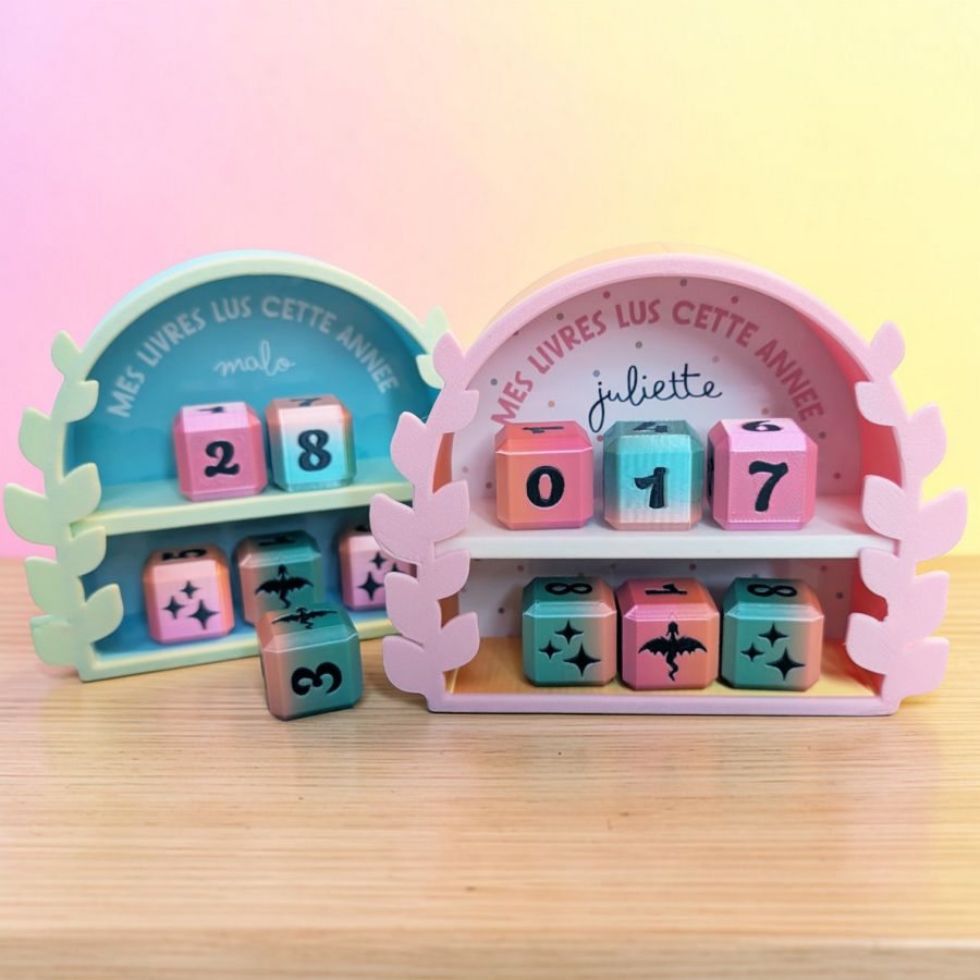 Fabriqué en PLA grâce à l’impression 3D, ce support en forme d’arche est à la fois léger, solide et agréable au toucher. Il est accompagné de 6 dés multicolores permettant d’afficher facilement le nombre de livres lus.