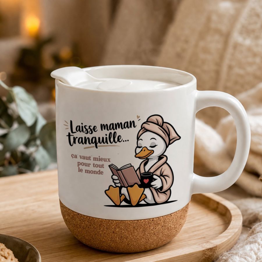 Son design délicat met en scène un petit canard relaxé, accompagné du message « Laisse maman tranquille… Ça vaut mieux pour tout le monde », pour un cadeau à la fois drôle et attendrissant.