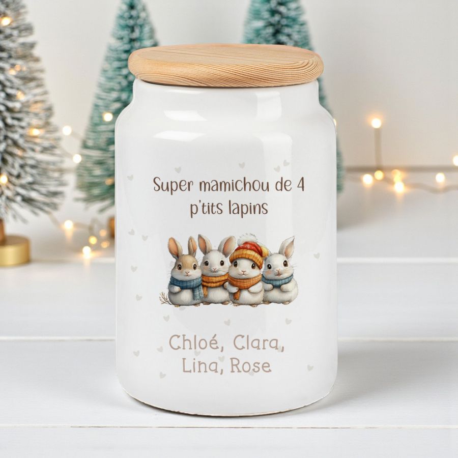 Ce joli bocal en céramique blanche avec couvercle en bois est personnalisé avec un adorable dessin de petits lapins et les prénoms de ses petits-enfants. Parfait pour y ranger des biscuits, du thé ou des douceurs, il trouvera sa place dans la cuisine ou sur une étagère.