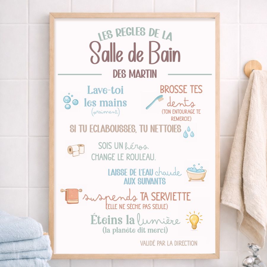 Affiche murale personnalisée “Les règles de la salle de bain” | Décoration salle de bain famille