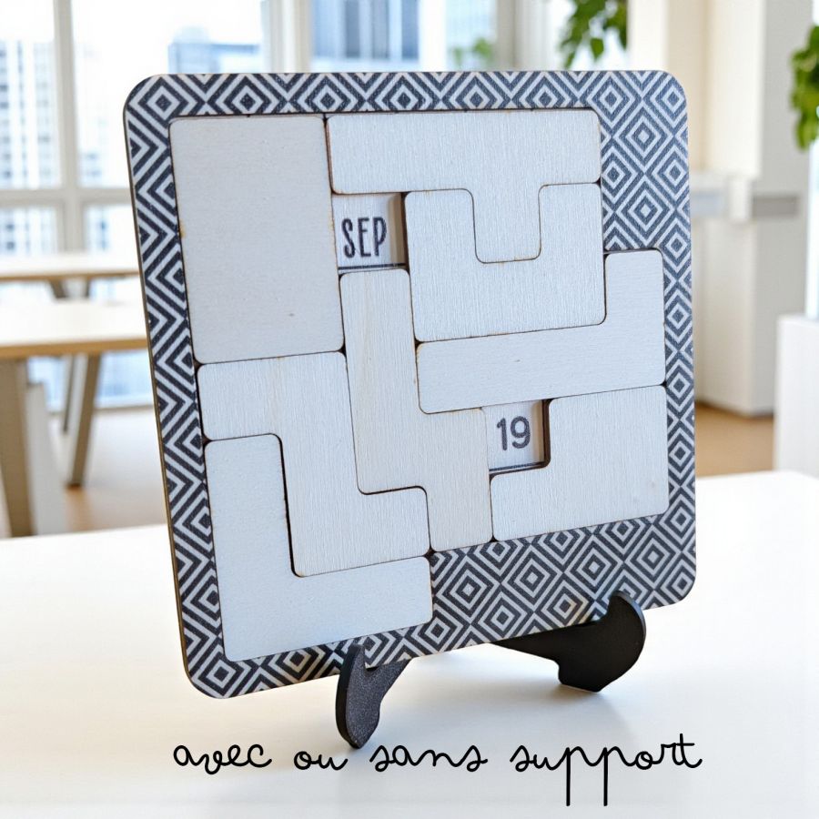 Ce casse-tête en bois imprimé vous invite à reconstituer un joli calendrier graphique en plaçant les pièces aux bons endroits pour laisser apparaitre le jour et le mois ! Pas si facile...