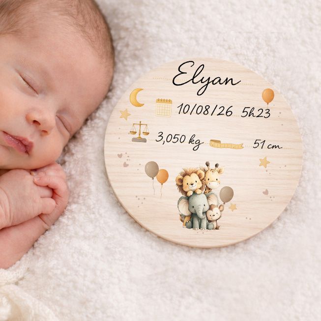 Joli disque en bois naturel de 13 cm de diamètre, spécialement conçu pour être rempli à la naissance de bébé.