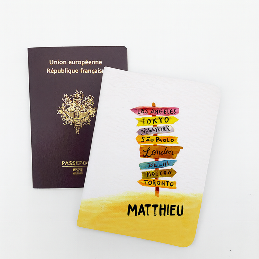 Protégez votre passeport ou celui de votre enfant avec cette housse rigide pour passeport, illustré et personnalisé avec le petit texte de votre choix.