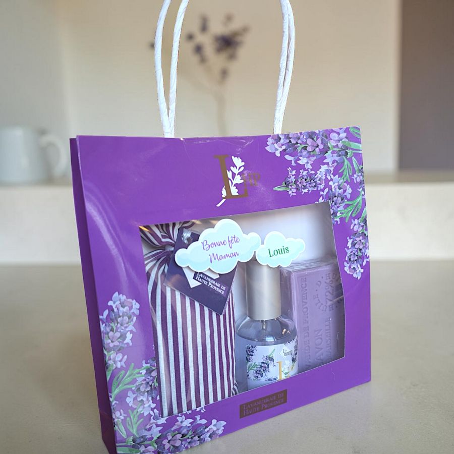 Sac cadeau personnalisé contenant 3 attentions parfumées à la lavande : une bourse lavande et lavandin d’environ 40 g, un savon lavande de 100 g et une brume d’oreiller lavande de 50 ml.