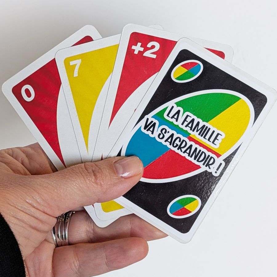 Ce sticker repositionnable au format 5,3 x 8,3 cm est conçu pour s’adapter aux cartes classiques type Uno. Il se colle directement sur la carte pour créer un effet surprise au moment parfait.