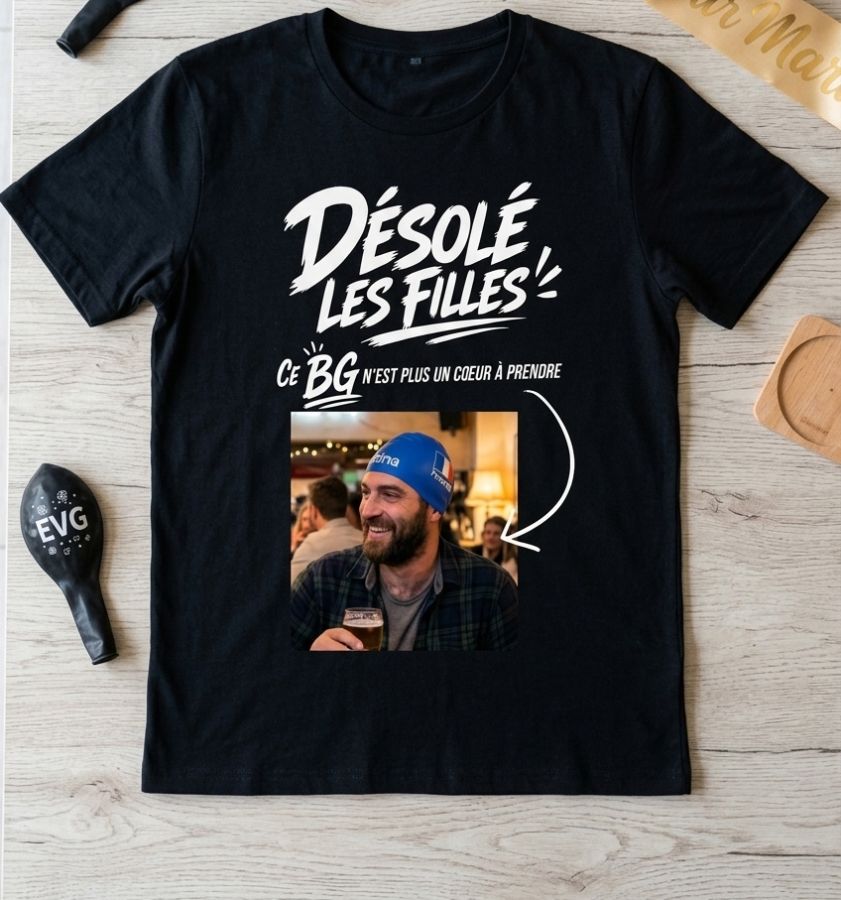 Ici, on ne parle pas d’un simple haut à porter pour faire joli. On parle d’un t-shirt qui lance l’ambiance dès le premier regard. La photo du futur marié, le message décalé, l’effet surprise au moment de la découverte… tout est réuni pour faire monter les rires avant même le premier verre. C’est le genre de détail qui met tout le monde dans le thème et qui garantit des souvenirs énormes sur les photos de groupe.